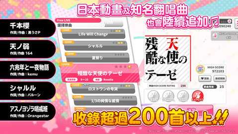 丰富的曲库收录了多首原创及授权歌曲,不同难度的谱面设计满足各水平玩家的需求。